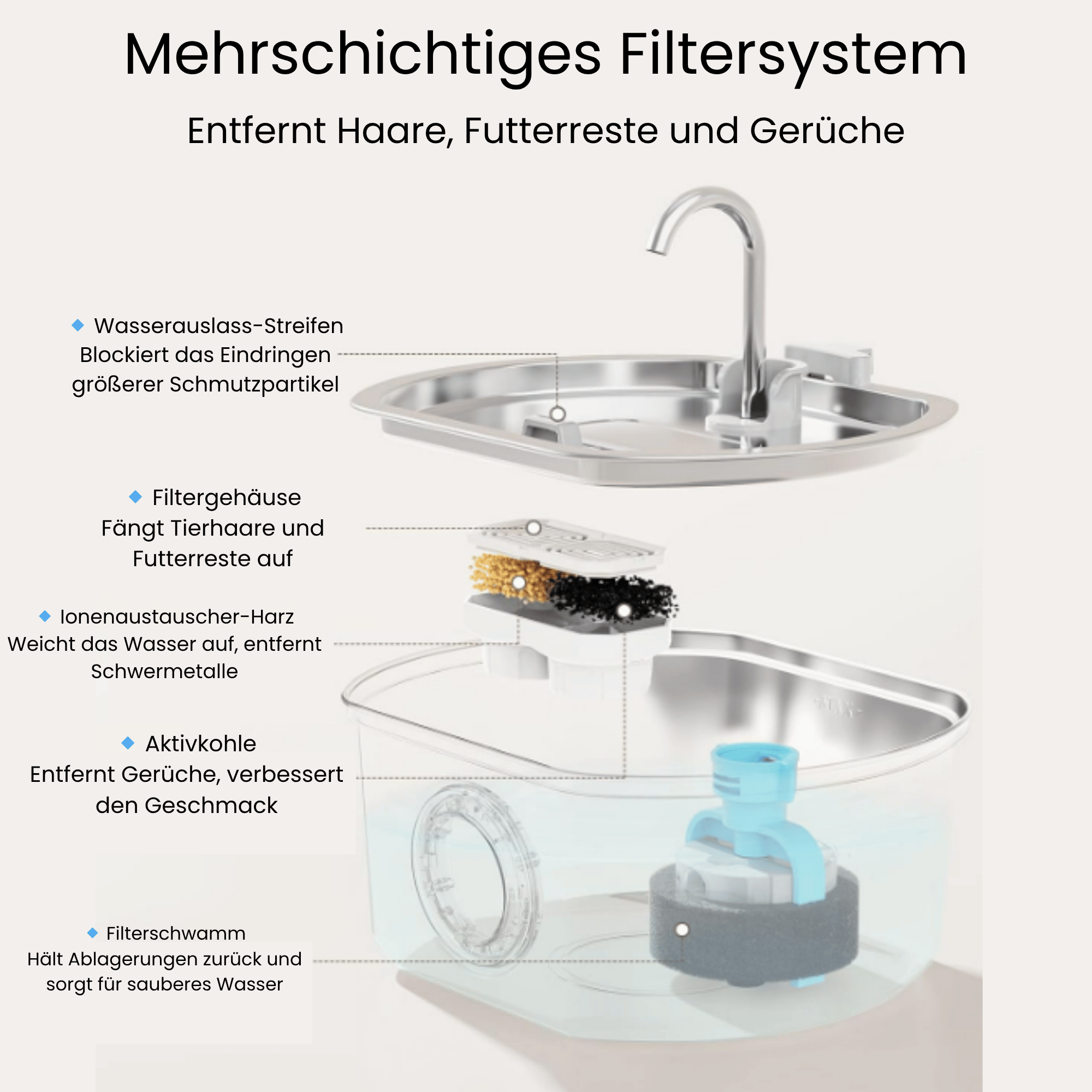 Der Brunnen verwendet ein mehrstufiges Filtersystem mit Aktivkohle und Schaumstoff. Es entfernt Haare, Schmutzpartikel, Gerüche und geschmackliche Verunreinigungen – für dauerhaft sauberes Wasser. Wir empfehlen die Filter alle 2 Wochen zu wechseln für das beste Ergebniss.